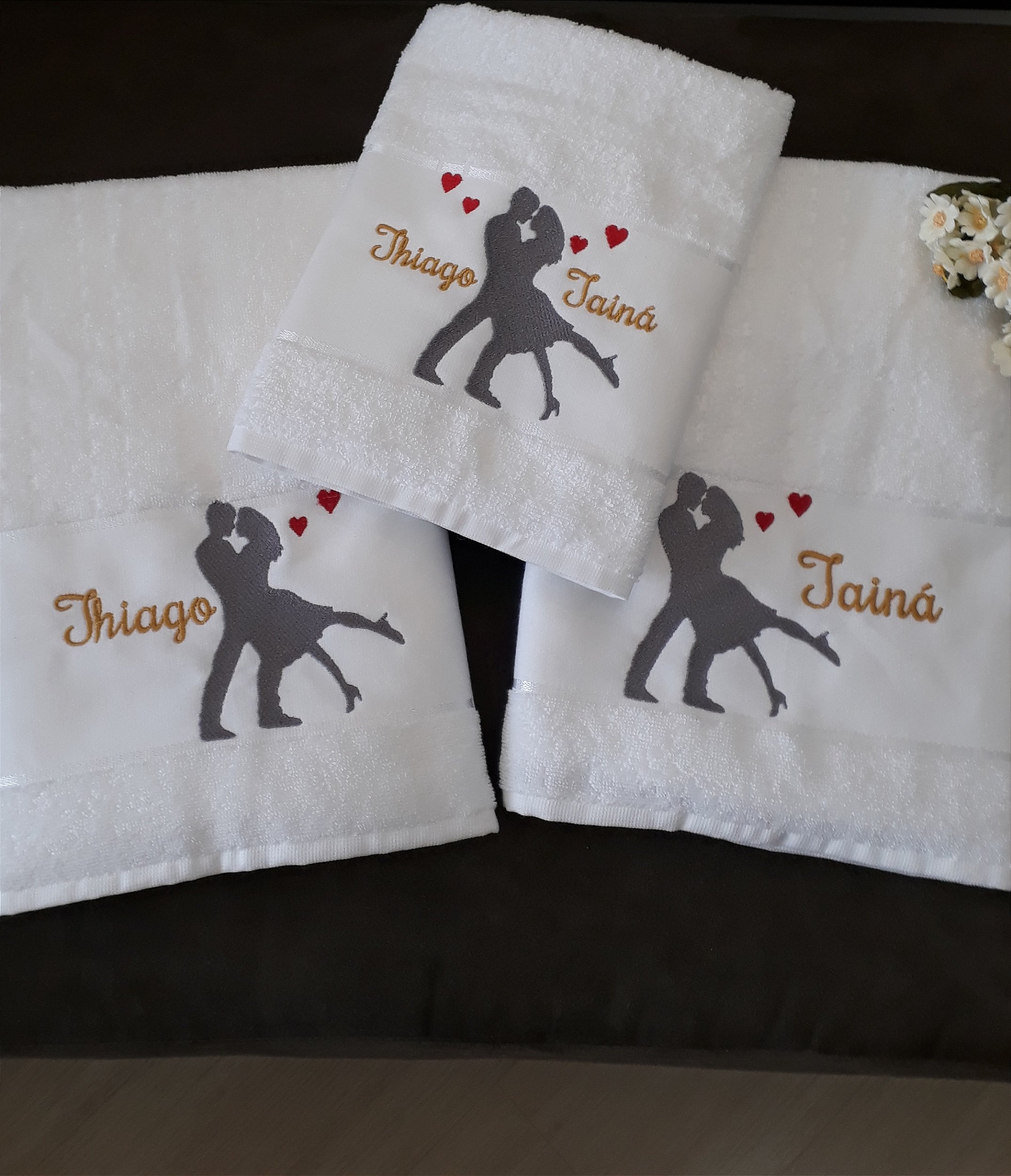 Jogo deToalhas casal 3 peças contendo 2 toalhas de banho e 1 rosto marca Döhler com bordado personalizado. Após a finalização do pedido, enviar os nomes a serem bordados para o whatsapp 11-99745-4007